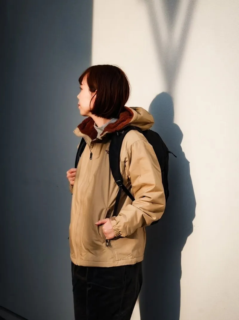 外装材には防水加工を施しているので、多少の雨や雪にも対応可能です。身頃とフードの裏地には毛足の短いフリースを使用しており、柔らかく肌触りが良く暖かいです。